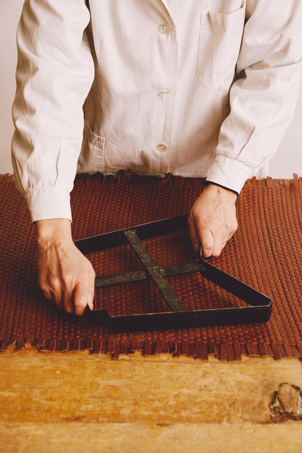 Das Besondere an den Parise-Taschen ist die Beherrschung einer exklusiven Technik, bei der dünnes Rindsleder in ein elegantes Gewebe verwandelt wird, das auf charmanten, jahrhundertealten Holzwebstühlen sorgfältig gewebt wird.